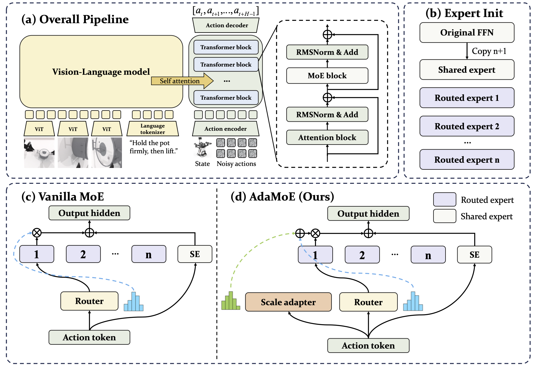 Our AdaMoE-VLA framework builds upon a pretrained flow-matching Vision-Language-Action (VLA) model π0, enhancing its action reasoning capacity through Mixture-of-Experts (MoE) integration. Our pipeline (Fig. a) processes multi-modal inputs through a vision-language model and a transformer-based action expert to predict continuous control. Each transformer block in the action expert incorporates an MoE layer (Fig. b) comprising shared experts, which inherit the original FFN weights to capture general manipulation patterns, and routed experts, dynamically selected by a router network to specialize in action-specific behaviors.