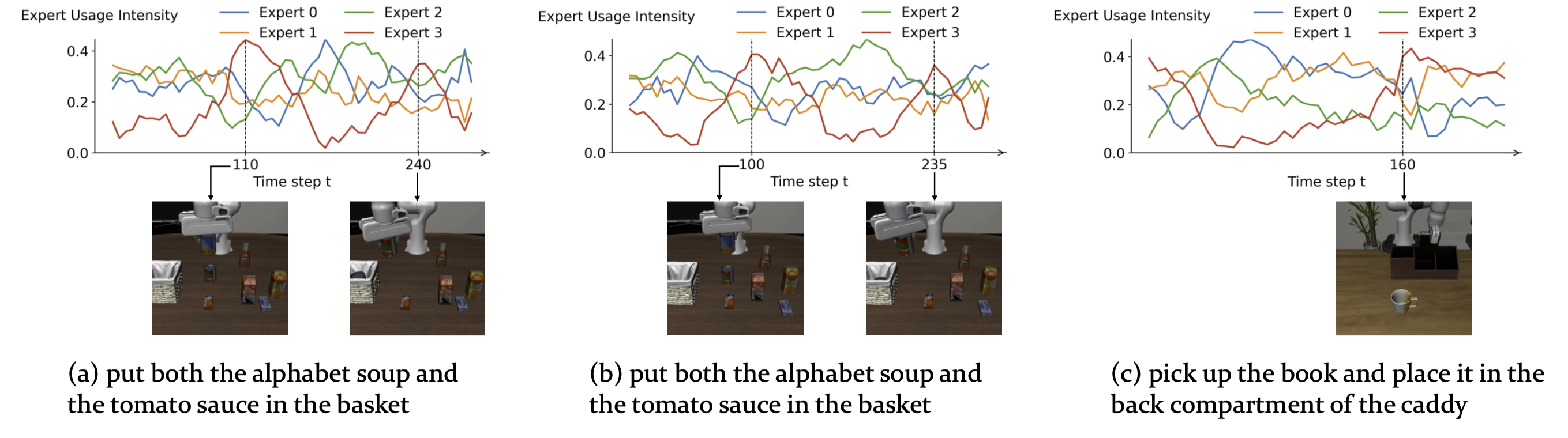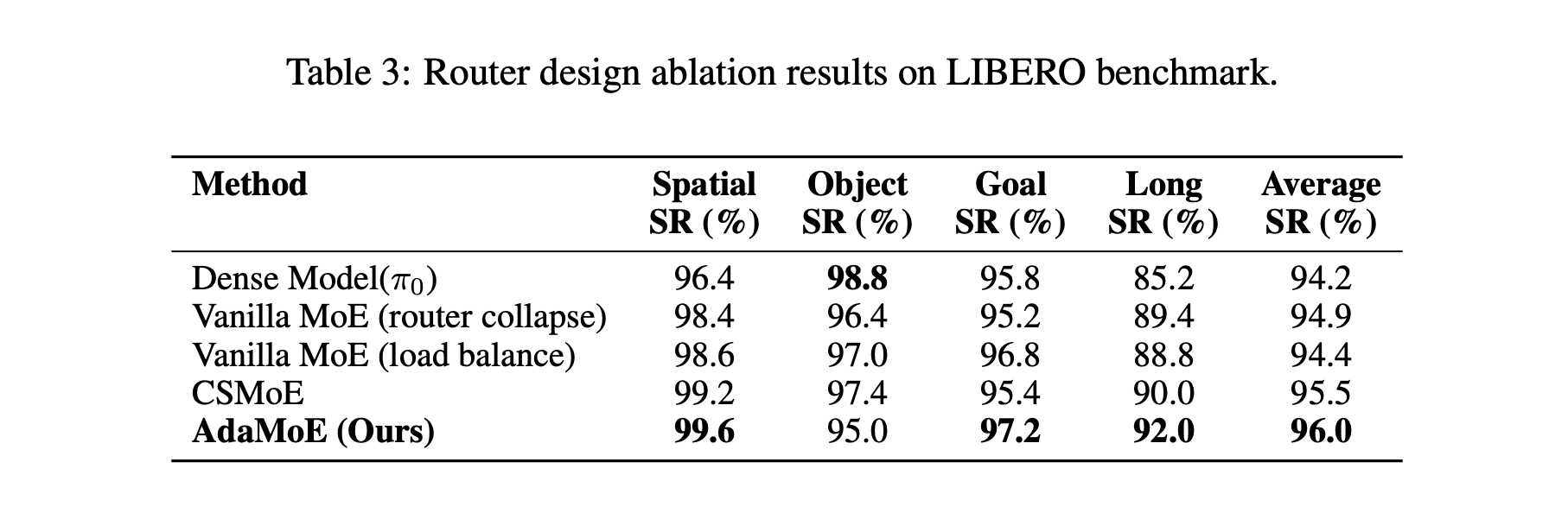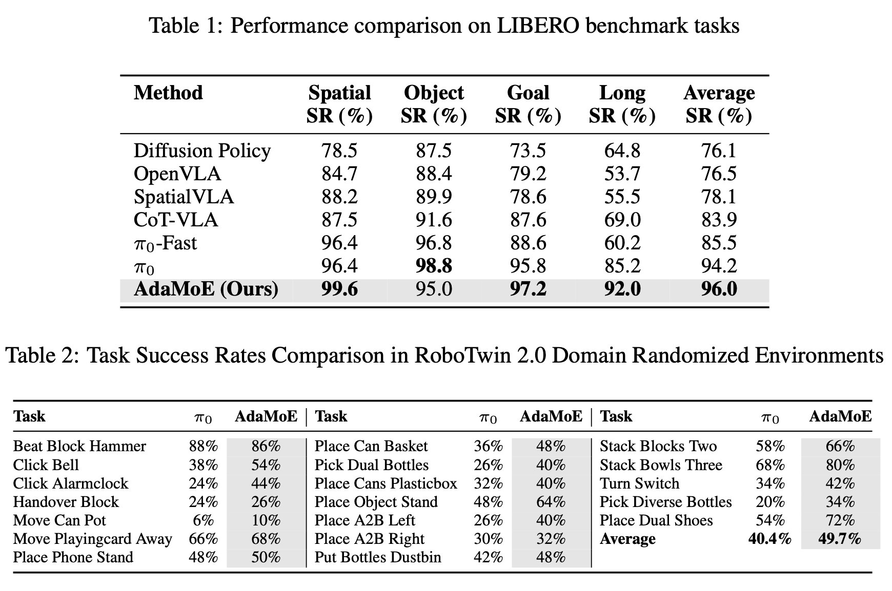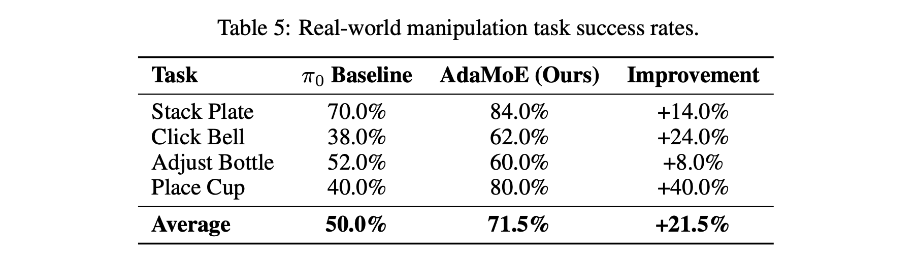 Table 5 presents the success rates of our AdaMoE-VLA compared to the π0 baseline across all four real-world manipulation tasks. Our method demonstrates consistent improvements across all tasks, with particularly notable gains in complex manipulation scenarios requiring precise coordination.