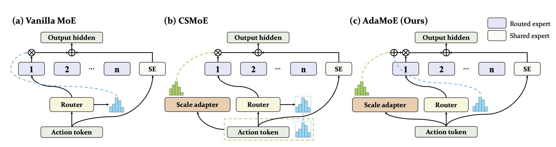 As shown in Fig. c, the vanilla MoE couples expert selection and weighting through a single router using top-k softmax gating. In contrast, our AdaMoE-VLA (Fig. d) introduces a decoupled architecture with an independent router for expert selection and a scale adapter for adaptive weighting. This design alleviates optimization conflicts between load balancing and task specialization, enabling more flexible and expressive expert collaboration for robust robotic control.